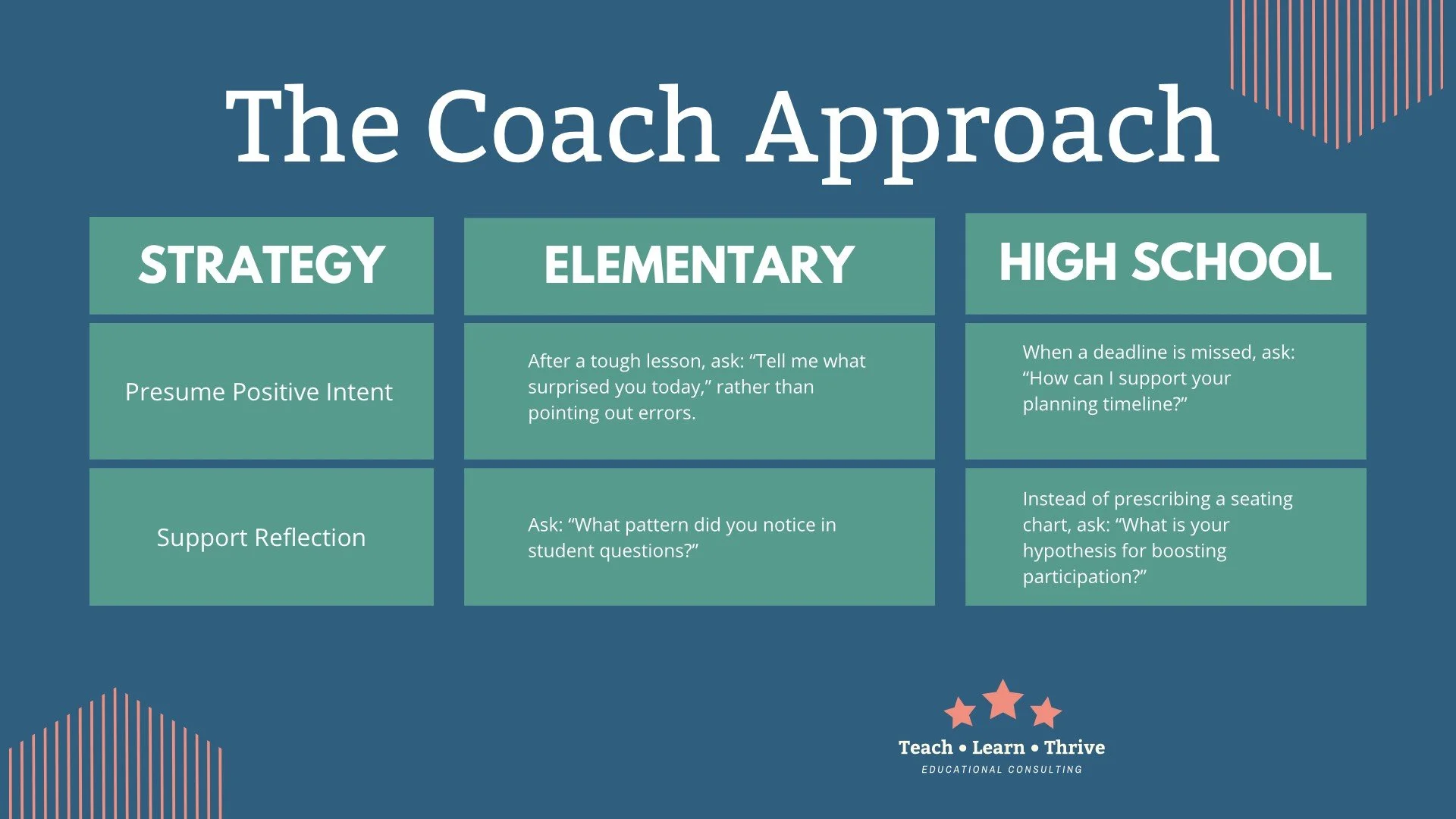The coach approach doesn’t preclude providing ideas and strategies to the teacher; it just leans toward empowering them to be a self-directed, reflective, and resourceful practitioner.